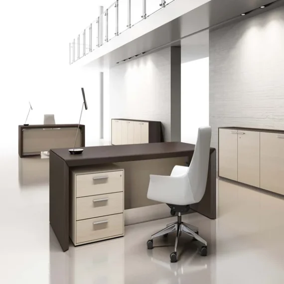 • It is the presidential collection that stands out with its elegant and sharp design, featuring unmistakable stylistic traits: a 45-degree angled profile, classic sides with storage units, high-quality wooden finishes and lacquered paint, and the contrast between the thickness of the desk surfaces and the thin frames of the furniture.