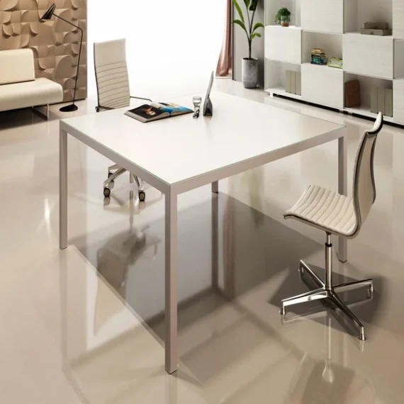 The standout feature is the modern and minimalist structure, with square-shaped legs and a comfortable top that seamlessly integrates with the outer frame. Stylistic details add further elegance and sophistication to the desk, emphasizing aesthetic purity and formal simplicity.
